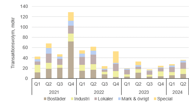 Ett mycket svagt juni, i alla fall fram till sista veckan hotade att sätta stopp för den stora återhämtning den svenska transaktionsmarknaden hittills uppvisat. Men med ett tillskott om cirka 8 miljarder sista veckan tippade bägaren till ett bra utfall jämfört med H1 2023, volymen H1 2024 är 23% högre. Året började med ett glädjeskutt och ett starkt Q1 som var upp drygt 40% mot föregående år, Q2 blev däremot betydligt svagare och ökade endast med 9% mot Q2 2023. Samtliga månader 2024 hade en högre transaktionsvolym än föregående år, utom juni. Svefa summerar transaktionsvolymen exklusive börs- och strukturaffärer för första halvåret till 64 miljarder kronor.